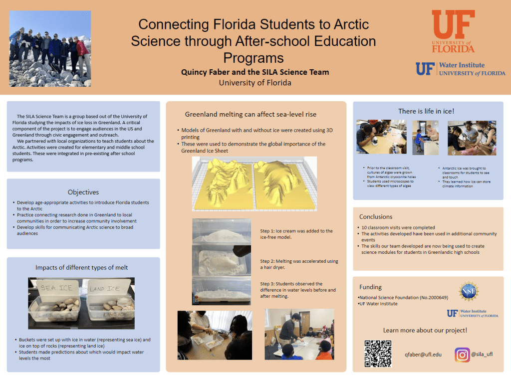 In addition to my scientific work, I am passionate about communicating polar science to students across the US. I have participated in Skype a Scientist since 2020 and have been involved innumerous outreach activities over the years including activities with the McAuliffe-Shepard Discovery Center and the Alaska Native Science and Engineering Program. My research team created a number of activities for use in Florida classrooms to help students understand the importance of arctic science and presented this work at AGU in 2022 (see poster below).